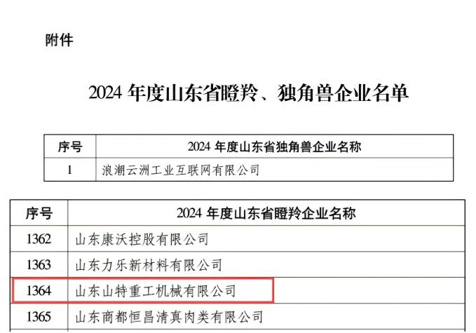 近日,山東省工業(yè)和信息化廳發(fā)布《關(guān)于公布2024年度山東省瞪羚、獨角獸企業(yè)的通知》,山特重工憑借著卓越的創(chuàng)新能力、高速的成長態(tài)勢,成功獲評2024年度“山東省瞪羚企業(yè)”。